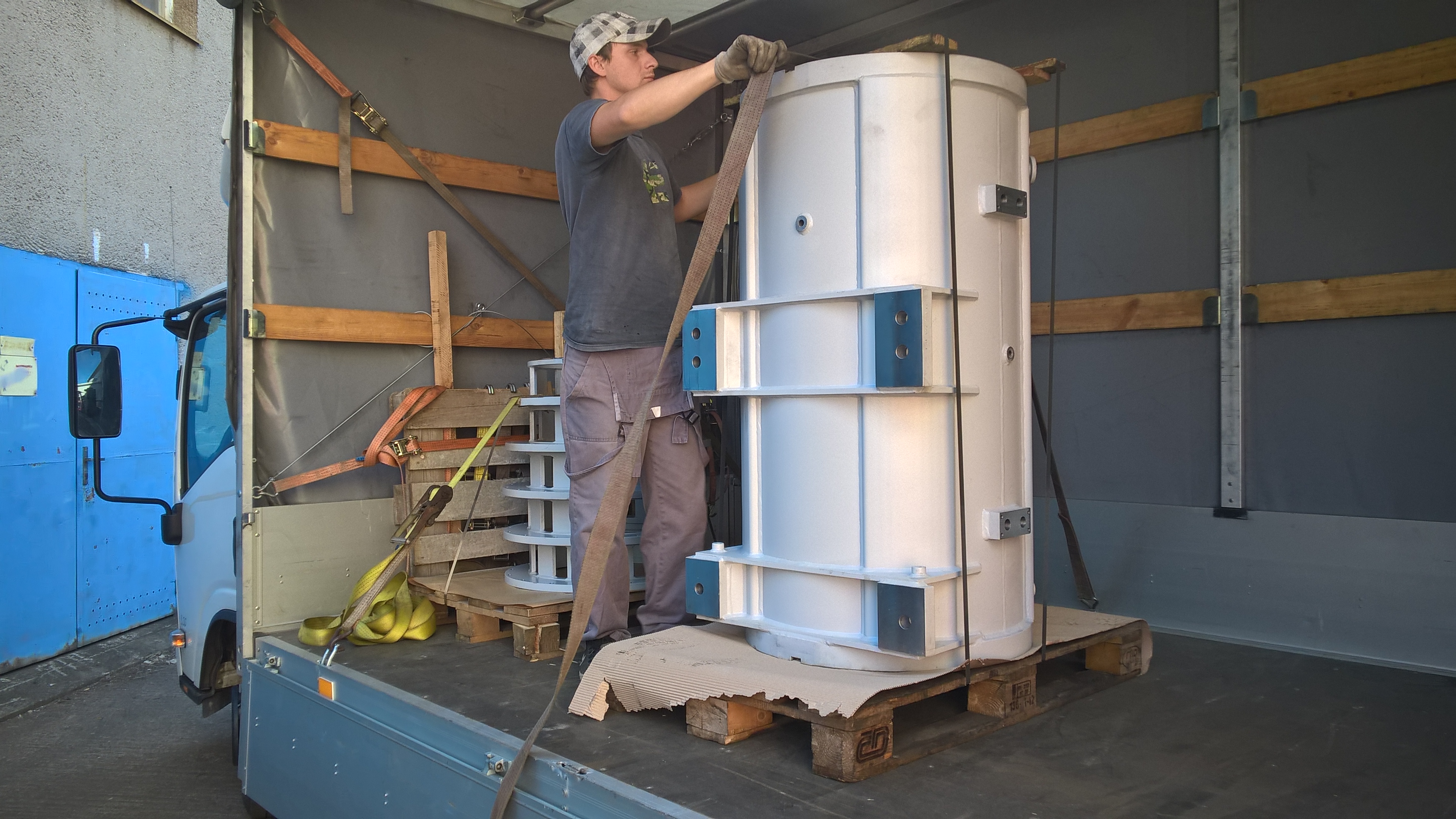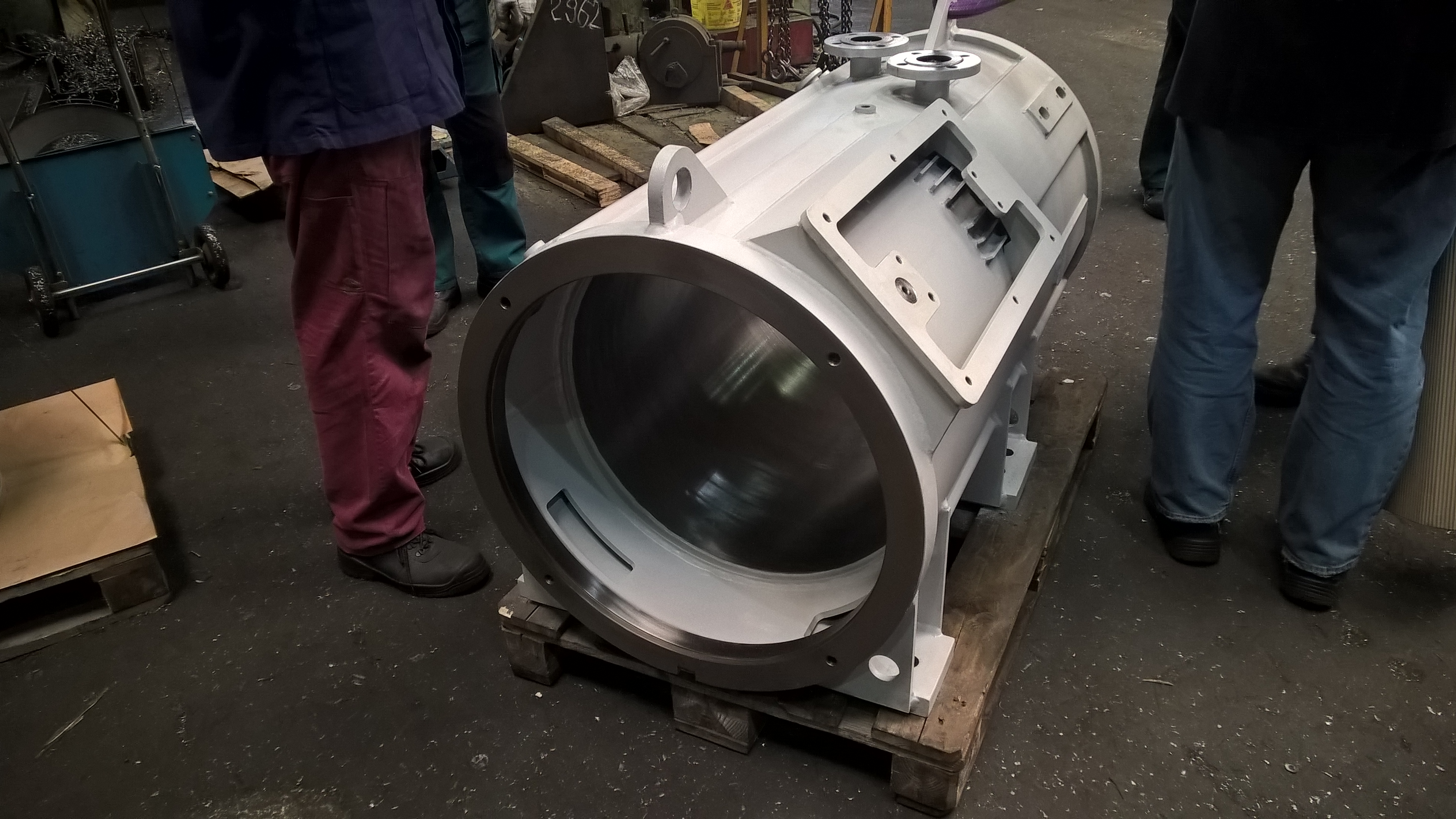 Opracovaný svařenec vodou chlazené kostry elektrického generátoru před expedicí. Výška kostry cca 1400 mm, průměr pro paket 600 mm, osov výška 355 mm. Hmotnost 600 kg.