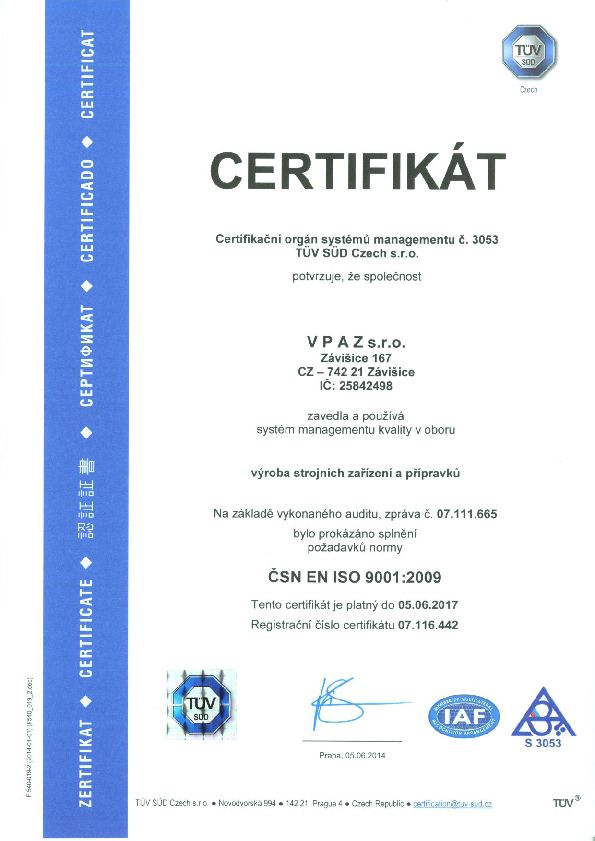 Společnost používá systém managementu kvality v oboru výroba strojních zařízení a přípravků. V roce 2011 byl tento systém auditován společností TÜV SÜD Czech s.r.o. dle normy ČSN EN ISO 9001:2009 a společnost obdržela certifikát - viz. níže.