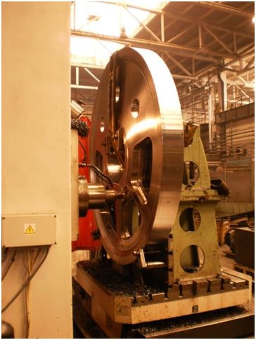 Naše společnost je poměrně dobře vybavena pro výrobu a opracování lanových kol o průměru až 2600 mm. K tomuto účelu můžeme využít klasický karusel SKJ25, kde již máme rozsáhlejší zkušenosti s opracováním tvaru lanové drážky za pomocí speciálně na míru vyráběných a povlakovaných tvarových nožů. Díry jsme schopni vrtat na horizontálních vyvrtávačkách. Jak vidíte na fotografii jsme schopni vyrobit lanovnici i z plného plechu bez předpálených otvorů v případě, že je to z technologického hlediska potřeba (kombinace karusel+CNC řízená horizontální vyvrtávačka). Kromě plechových lanovnic opracováváme i odlitky dodané našimi odběrateli k opracování. Lanovnice na obrázku má průměr lanové drážky přibližne 1650 mm.